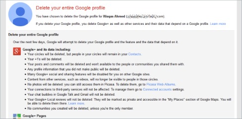 - Delete confirmation page will appear. Go over the details before delete your Google Profile and make sure you know what type of data will remove.